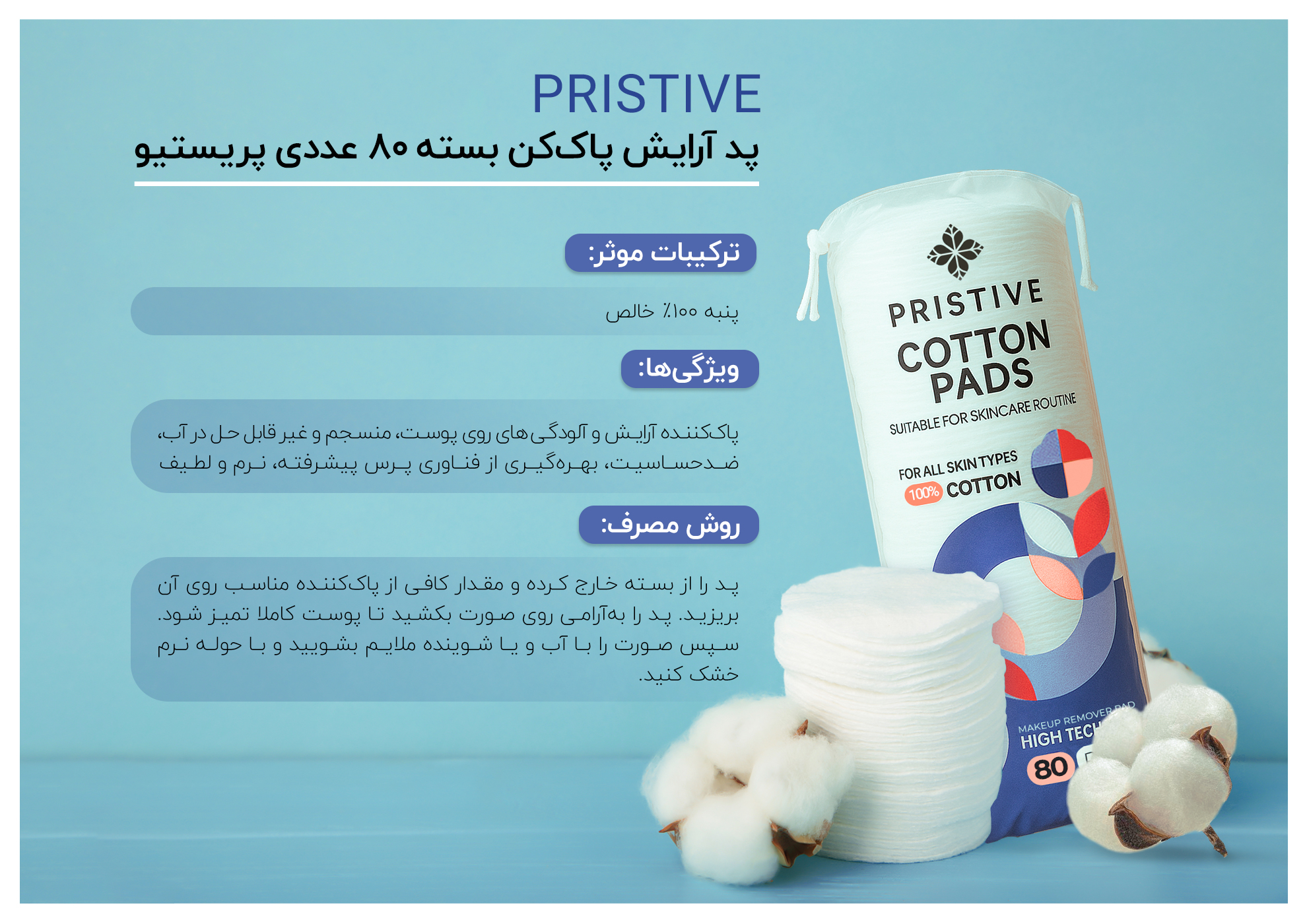 پد آرایش پاککن بسته 80 عددی پریستیو، محصولی بسیارکاربردی برای استفاده به همراه تونر، میسلار واتر، محلول آرایش پاککن و شیرپاککن است. این پدها از پنبه ۱۰۰٪ خالص بهصورت منسجم تولید شدهاند و در آب حل نمیشوند. این محصول با کیفیت بالا و قدرت جذب مناسب، فاقد هرگونه مواد شیمیایی بوده و گزینهای مؤثر برای استفاده روزانه در روتین پوستی بهشمار میرود.