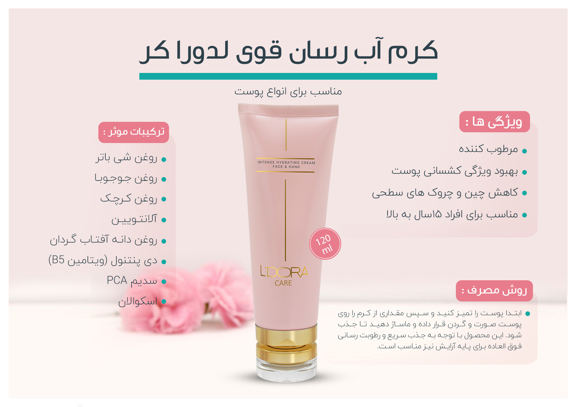 این محصول حرفهای یک مرطوبکننده مناسب برای انواع پوست است مواد موثر منحصر بهفرد موجود در کرم آبرسان قوی لدورا علاوه بر آبرسانی به بهبود ویژگی کشسانی (الاستیسیته) پوست نیز کمک میکند.