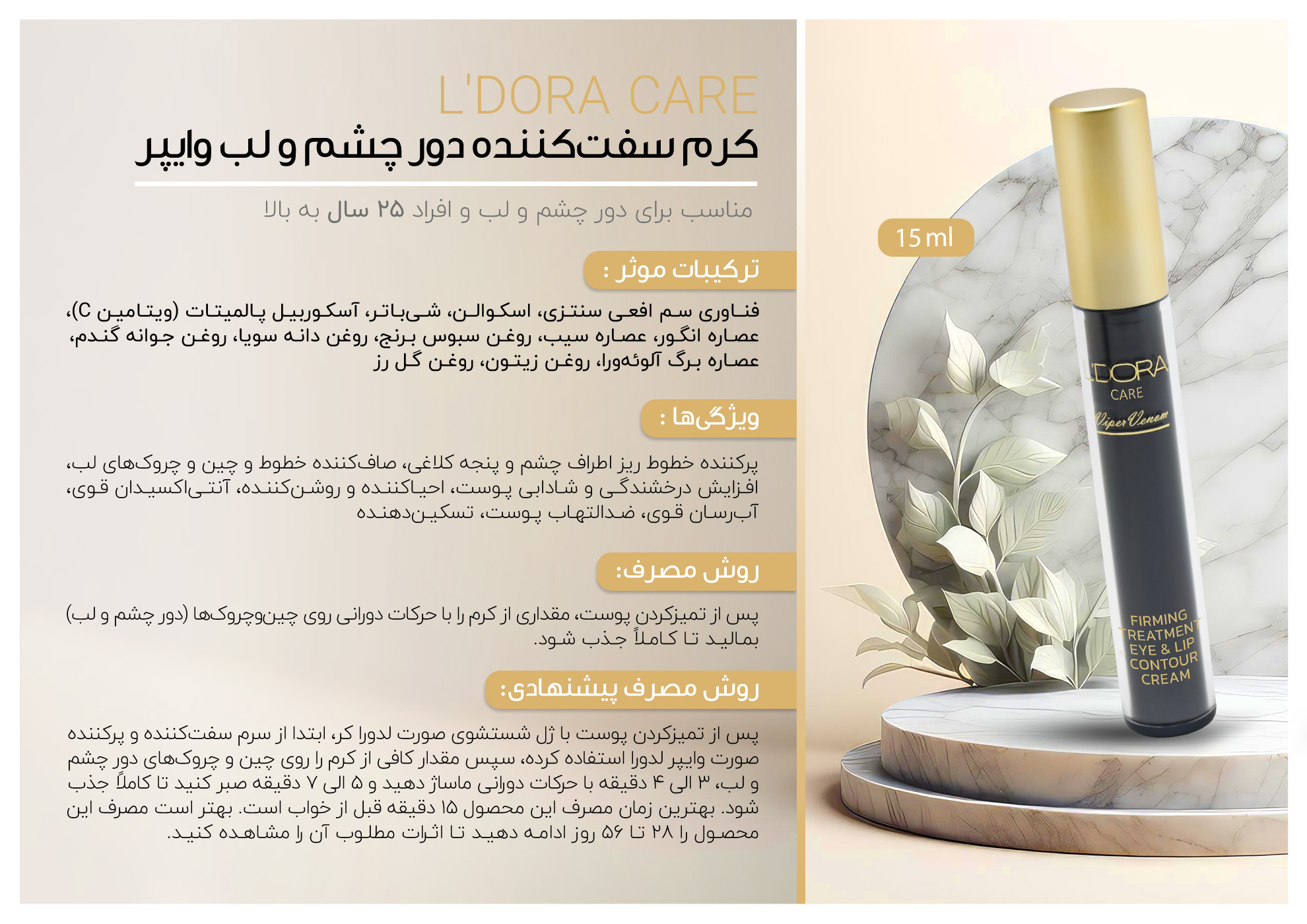 روش مصرف پيشنهادي: پس از تميزکردن پوست با ژل شستشوي صورت لدورا کر، ابتدا از سرم سفتکننده و پرکننده صورت وايپر لدورا استفاده کرده، سپس مقدار کافي از کرم را روي چين و چروکهاي دور چشم و لب، 3 الي 4 دقيقه با حرکات دوراني ماساژ دهيد و 5 الي 7 دقيقه صبر کنيد تا کاملا جذب شود.